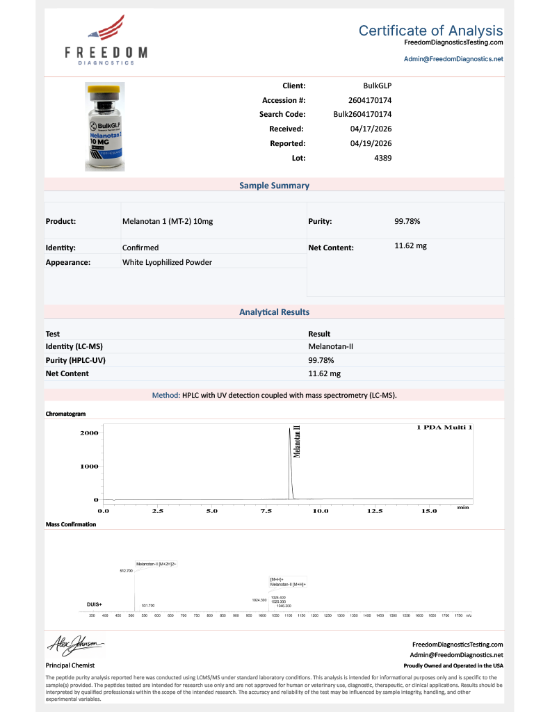 This product is strictly for laboratory and research purposes only. Melanotan 2 (MT-2) is not intended for human use, diagnostic, or therapeutic procedures. It serves as a reagent for scientific study and method development.