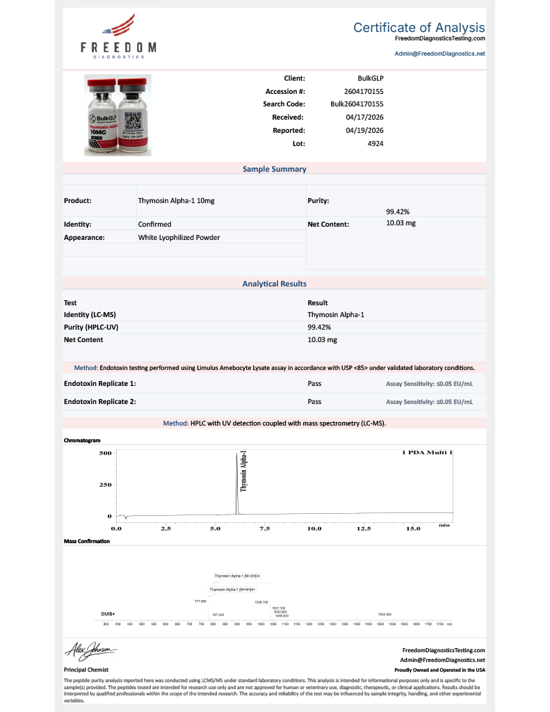 This product is strictly for laboratory and research purposes only. Thymosin alpha-1 (TA-1) is not intended for human use, diagnostic, or therapeutic procedures. It serves as a reagent for scientific study and method development.